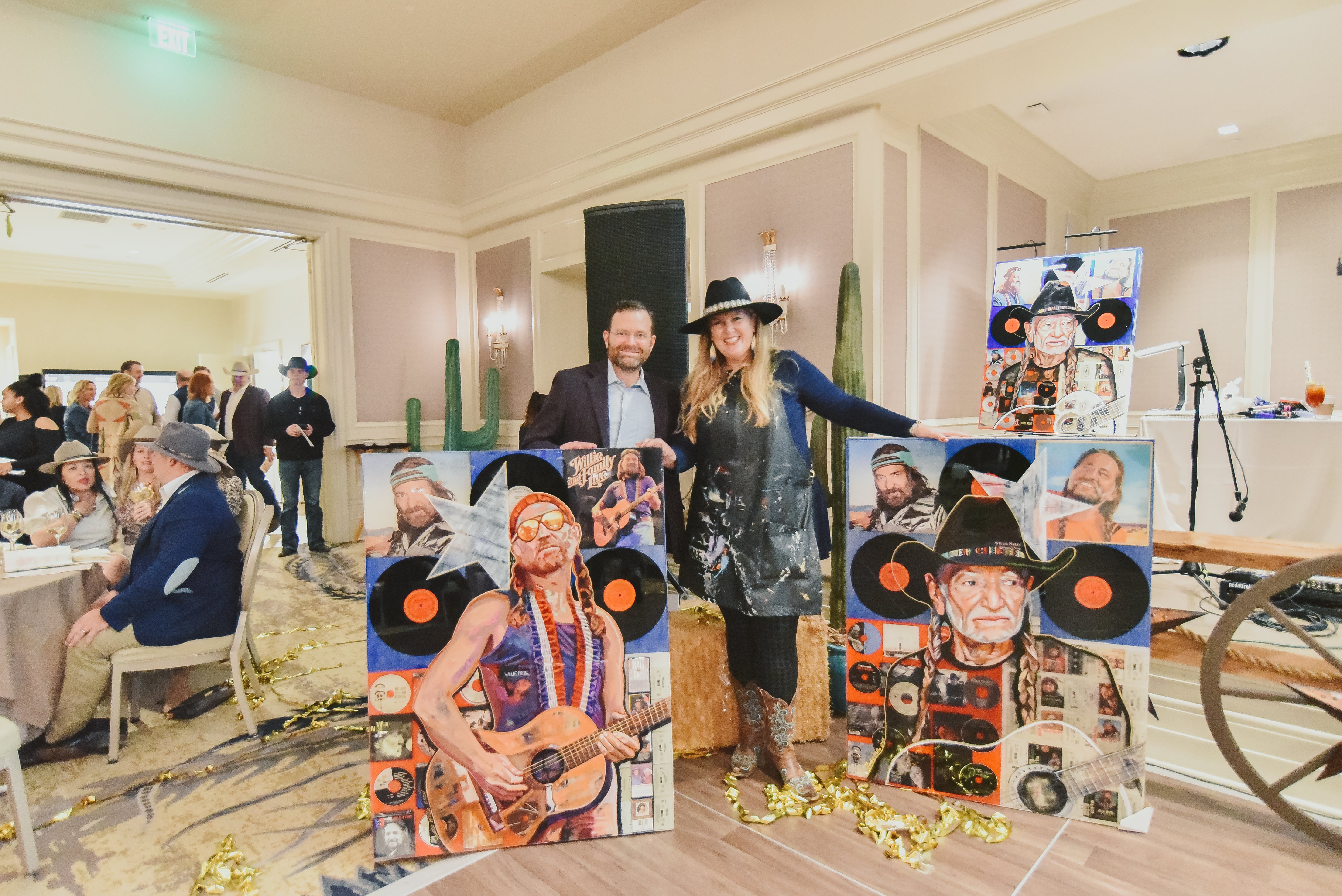 At a benefit supporting urban youth through Stoney Creek Ranch, Jamie Wells unveiled a bold and unforgettable pop-art tribute to the legendary Willie Nelson. Painted live in front of an inspired audience, the artwork featured dual portraits of Willie—one capturing him as a young outlaw artist, the other as the wise, soulful icon he is today.