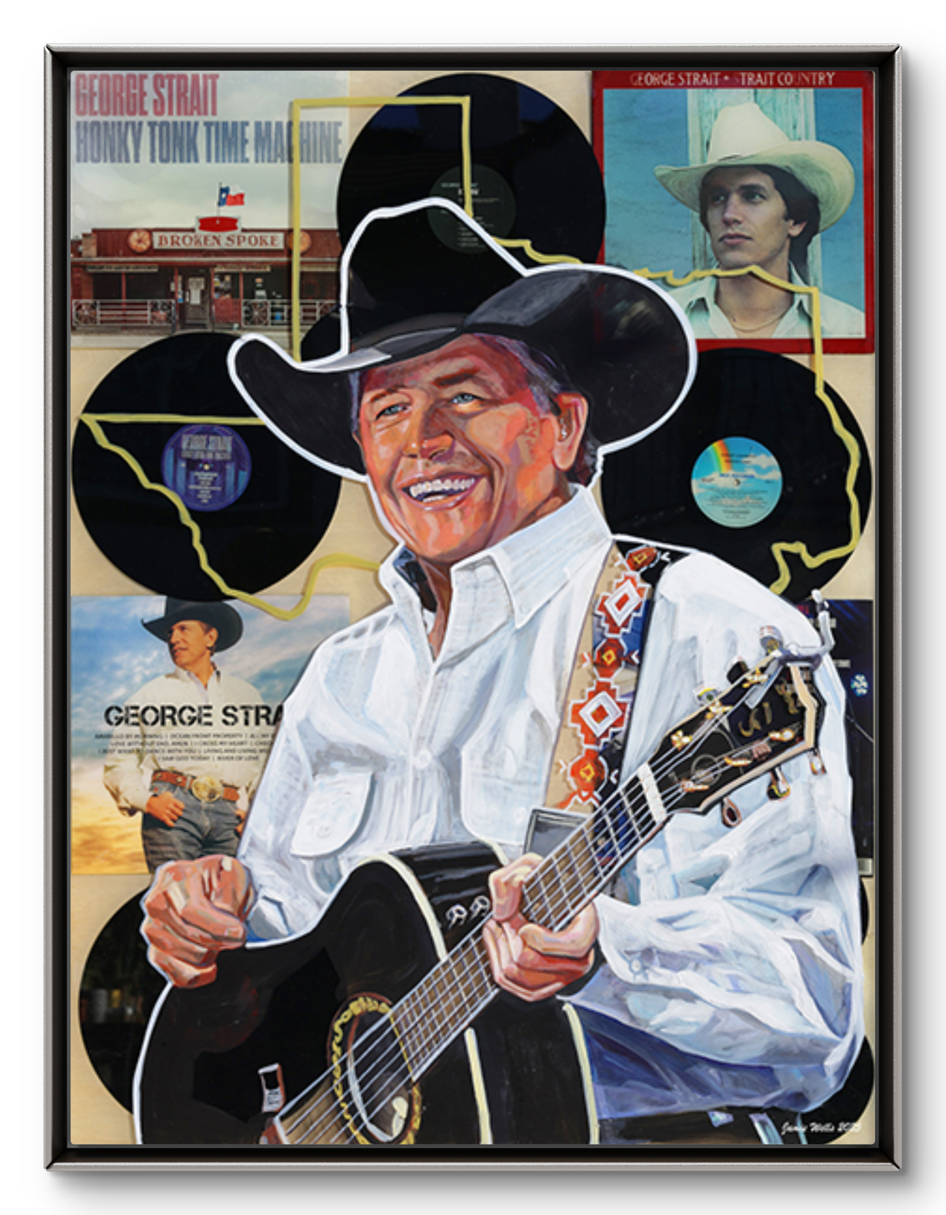 What made this piece truly unforgettable was the foundation: authentic George Strait vinyl records, carefully embedded into the canvas and sealed beneath layers of crystal-clear resin before Jamie laid down her first brushstroke. The result was a powerful fusion of music memorabilia and contemporary fine art—honoring both the sound and soul of a country music icon.