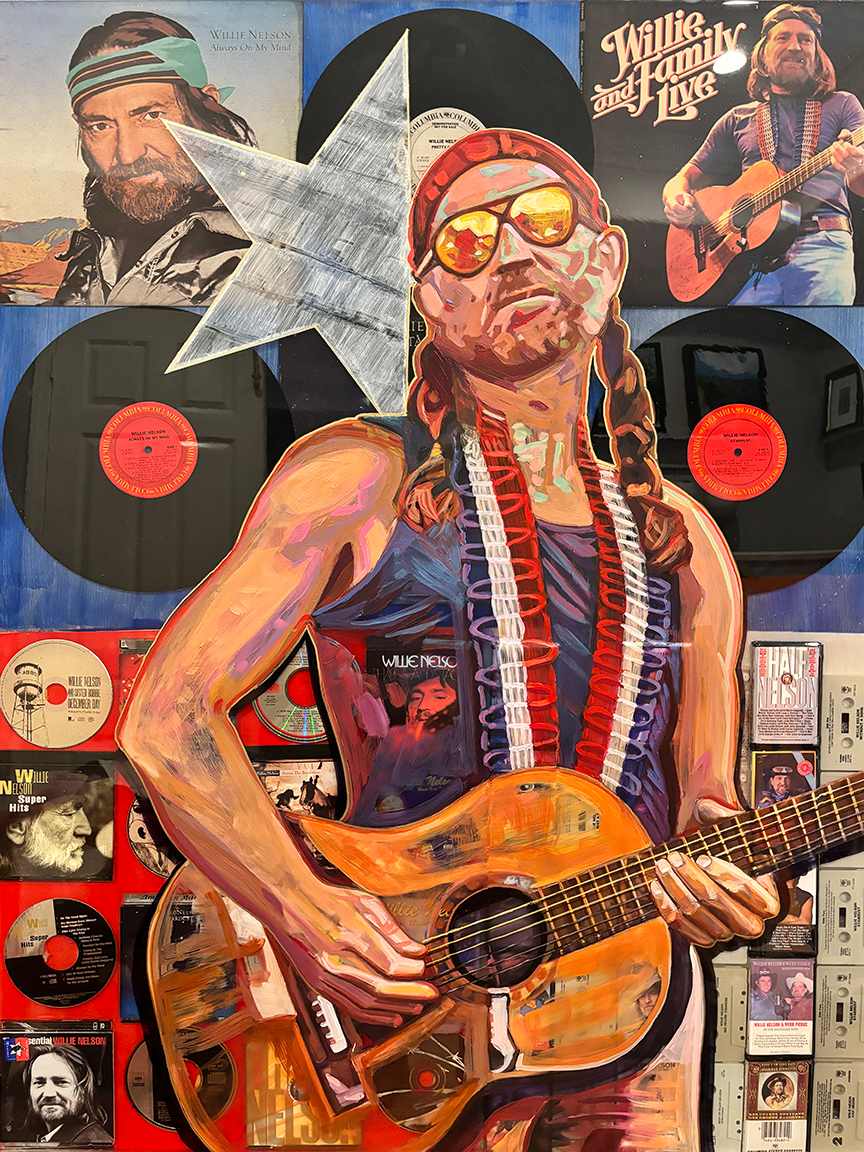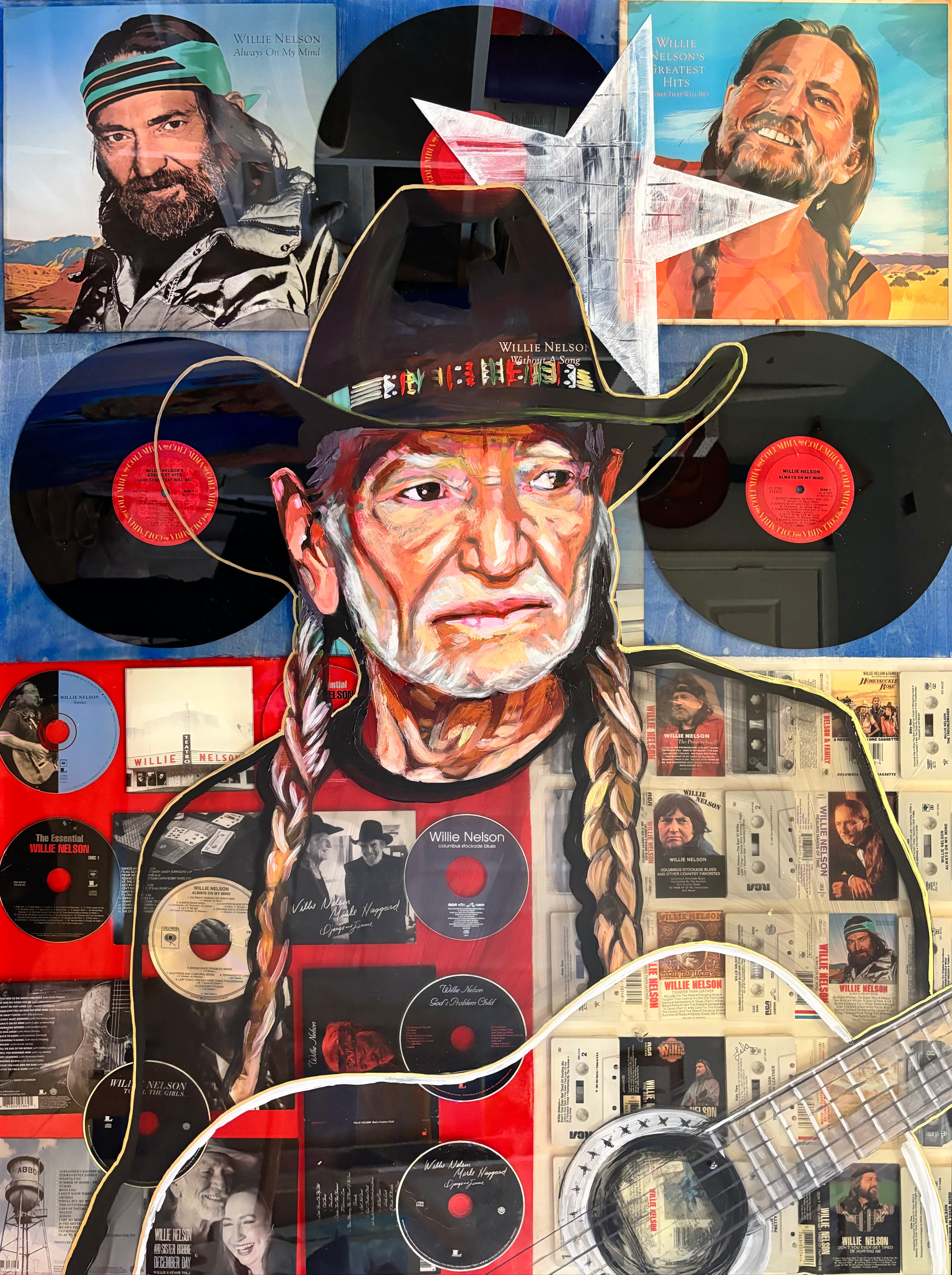 To deepen the impact, Jamie embedded authentic memorabilia—vintage vinyl records, cassette tapes, and CDs—into the canvas, sealing them under a layer of crystal-clear resin. This fusion of music history and visual storytelling gave the piece a powerful texture and emotional resonance, celebrating not only Nelson’s artistry but the legacy he’s left across generations.