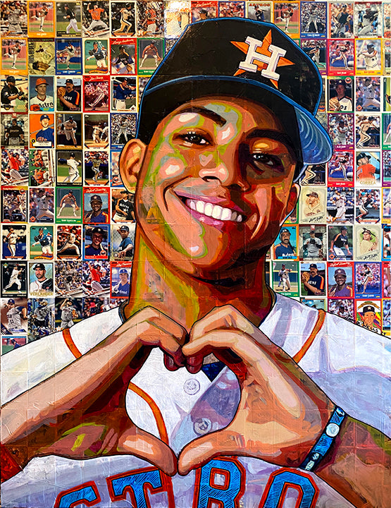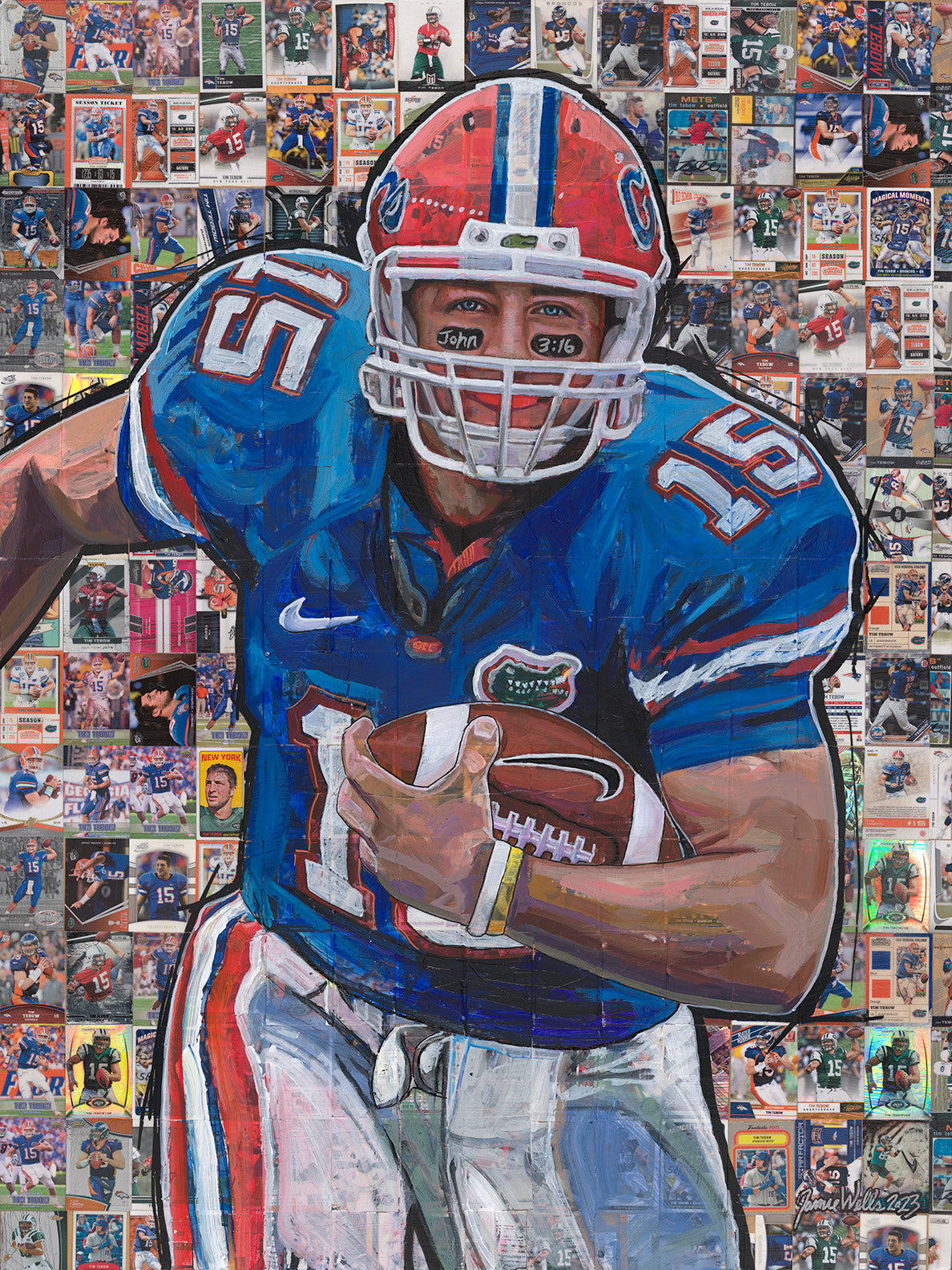 What made this piece truly extraordinary was its foundation: an authentic collection of Tim Tebow’s football and baseball trading cards, carefully curated and permanently embedded into the canvas beneath crystal-clear resin. The result was a striking fusion of sports memorabilia and contemporary fine art—honoring both his legacy on the field and his ongoing impact off of it.