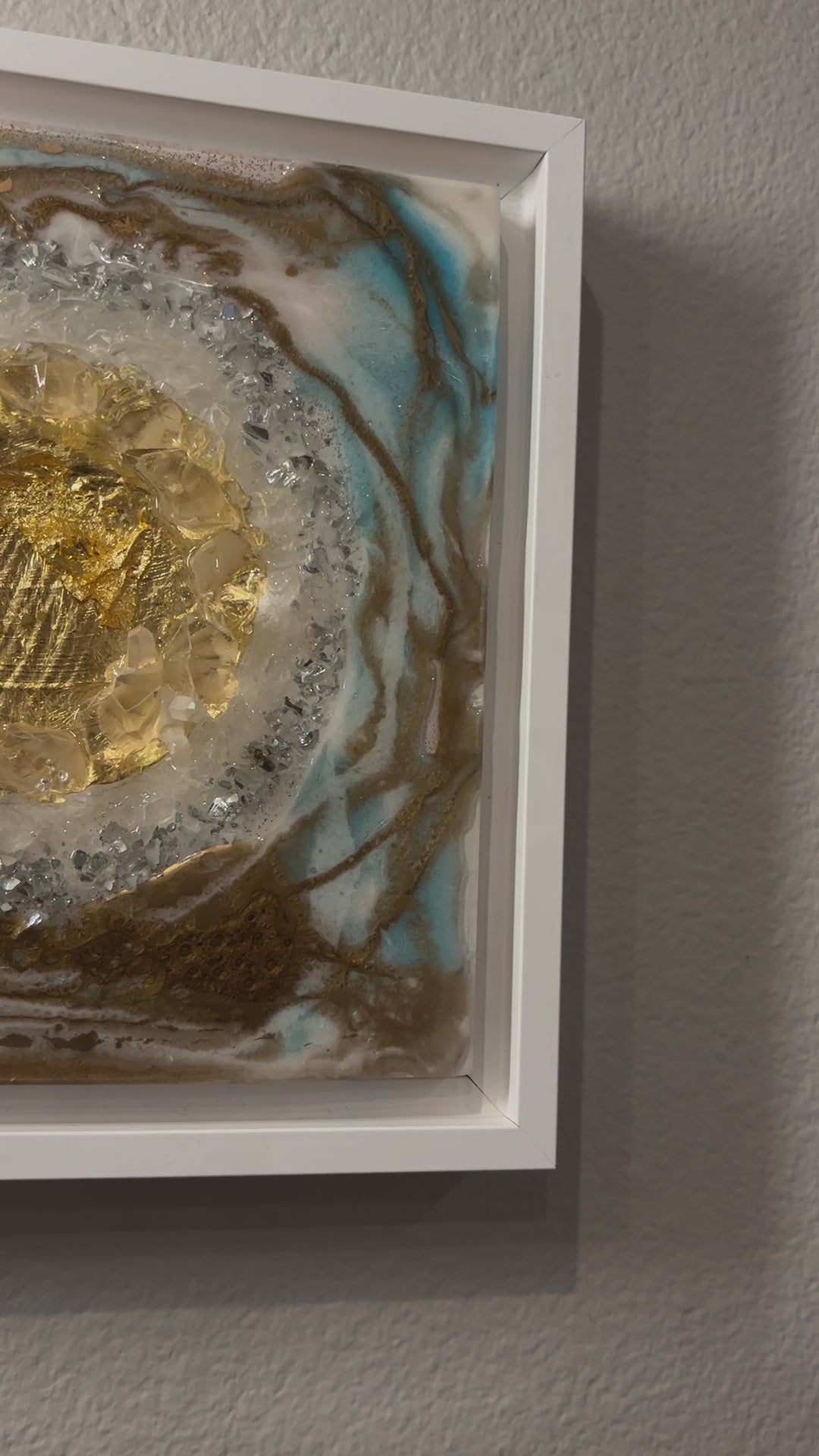 - Medium: Mixed media featuring gold leaf, crystals, gemstones, mica flecks, and marbled textures
